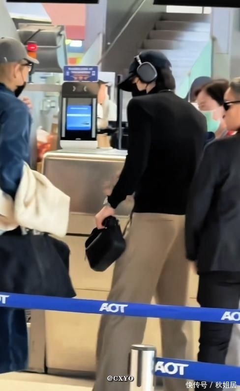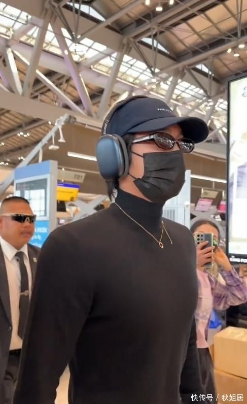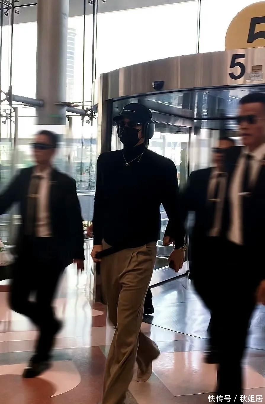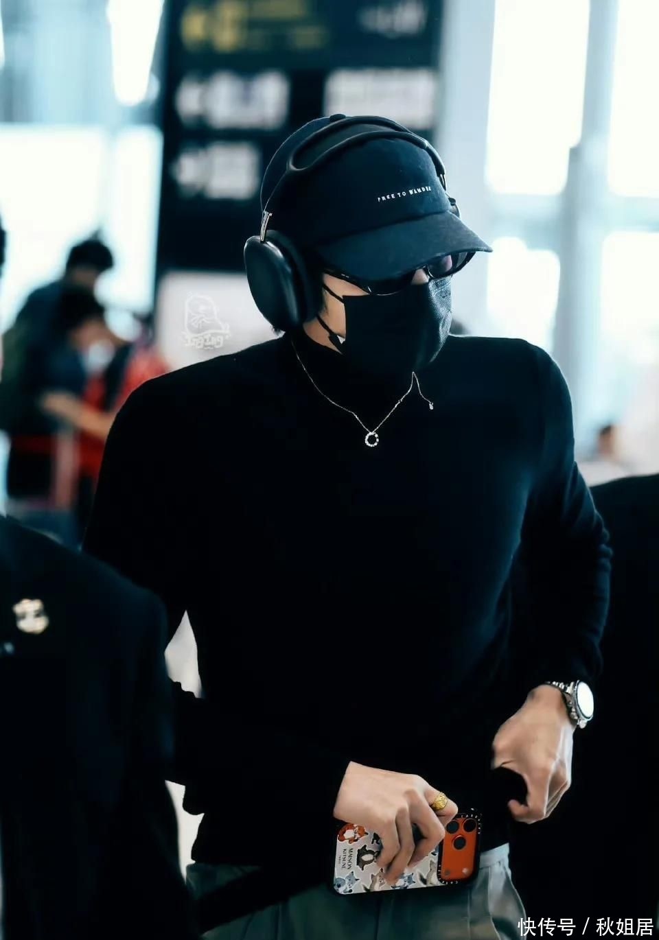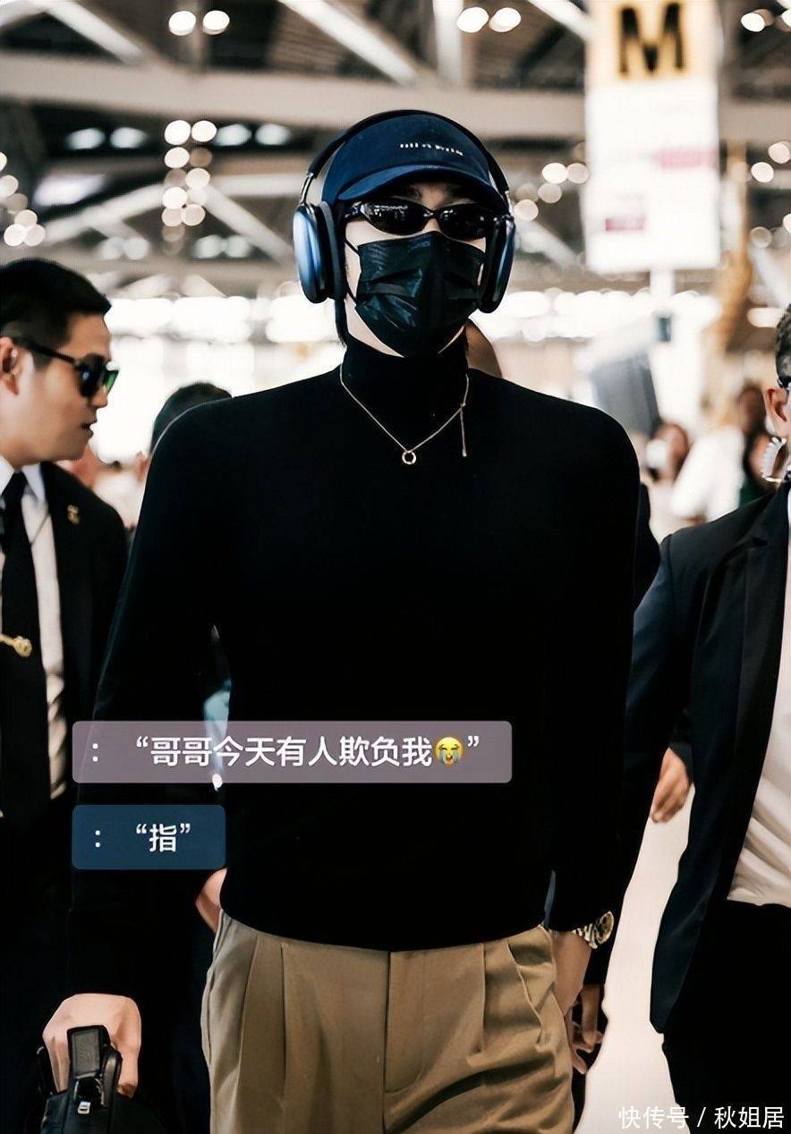 当天他身穿黑色修身高领针织衫,外搭棕褐色垂感垂坠长裤,头戴黑色拼接棒球帽,墨镜与医用外科口罩遮住大半面容,仅露出下颌线条与挺拔脖颈。