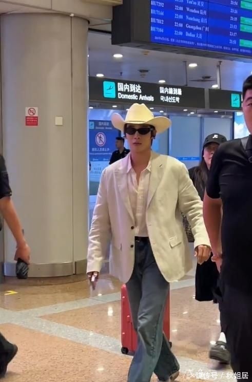 此前一次北京首都国际机场偶遇中,他身着米白色轻盈廓形西装外套,下搭浅靛色修身牛仔长裤,头戴同色系复古牛仔渔夫帽,无繁复配饰点缀,却将肩线、腰线与腿部比例自然呈现。